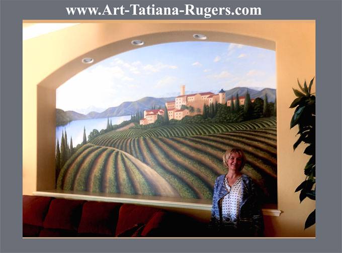 I had been living in my new home a couple months, looked at the artist’s blog online a few times, and finally decided it was time to introduce myself to Tatiana Rugers and inquire if she ever had the opportunity to see her incredible paintings after the murals were adhered to the walls of my Tuscan-style home. Every day, I look at these paintings and imagine where this Italian winery is located or if it’s even real or some days when I walk down the hallway and cast my eyes on the lake scene imagery I wonder if it’s Lake Como or somewhere in the magical region of Tuscany. Is this painting a real place or an interpretation of a few wineries on as seen during international travels Tatiana has made with her husband? What was the artist thinking when she painted these images? These thoughts pass through my mind each time I look at these paintings and getting to meet Tatiana was an exciting thought for me.