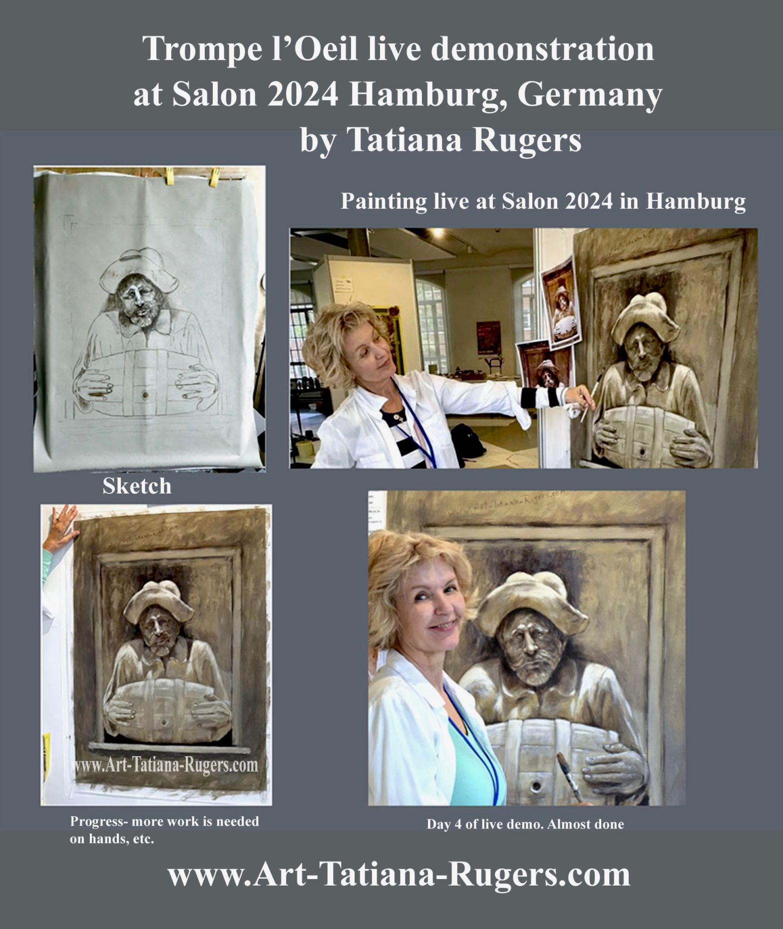 I recently came back from Hamburg, Germany where, together with many great artists from many countries, I exhibited my painting inspired by Karl Lagerfeld. You could see it in my previous post-news issue. I also painted Trompe l’Oeil live during that Salon. You can see stages of it on my photo here. And as always-Continue reading “Trompe l’Oeil – Live demonstration at Salon 2024 in Hamburg. Artist Tatiana Rugers”